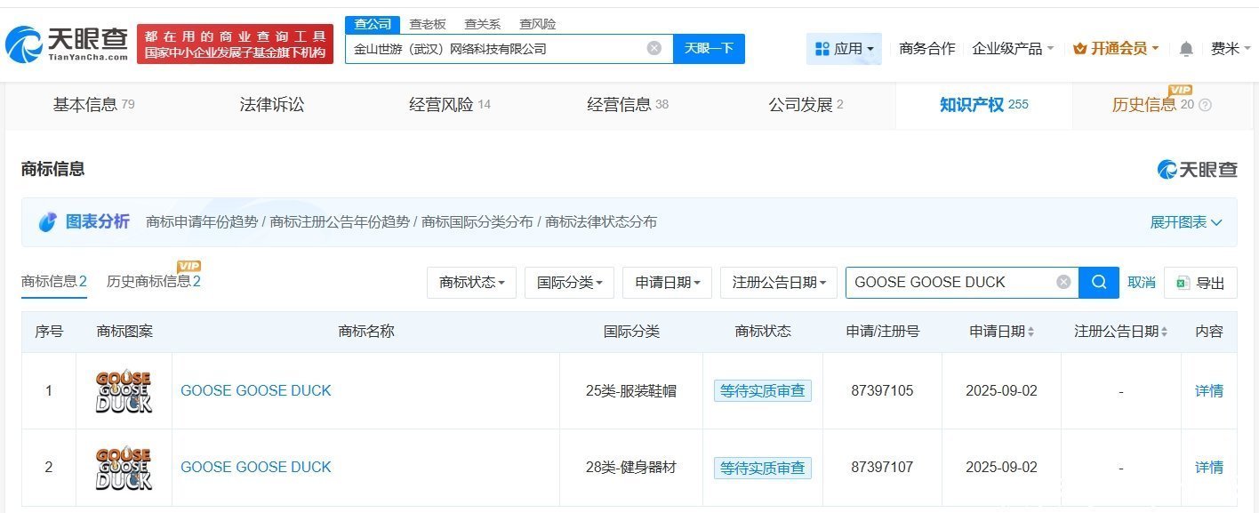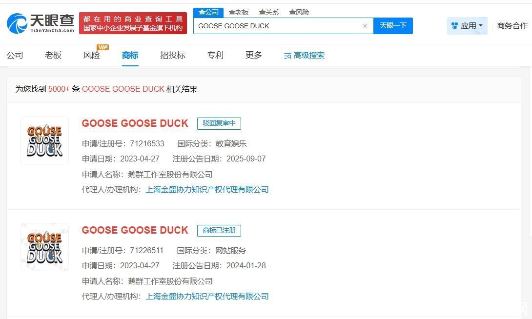 值得一提的是,知识产权信息显示,鹅鸭杀出品方GAGGLE STUDIOS,INC.(即鹅群工作室股份有限公司)曾申请注册多枚“GOOSE GOOSE DUCK”商标,国际分类包含教育娱乐、网站服务、科学仪器等,当前部分商标已成功注册。此外,金山世游关联公司金山世游(武汉)网络科技有限公司于去年9月申请注册“GOOSE GOOSE DUCK”商标,国际分类为服装鞋帽、健身器材,当前商标状态为等待实质审查。公开资料显示,金山世游作为鹅鸭杀中国大陆地区独家代理发行商,全面负责游戏的本土化运营及移动端开发。