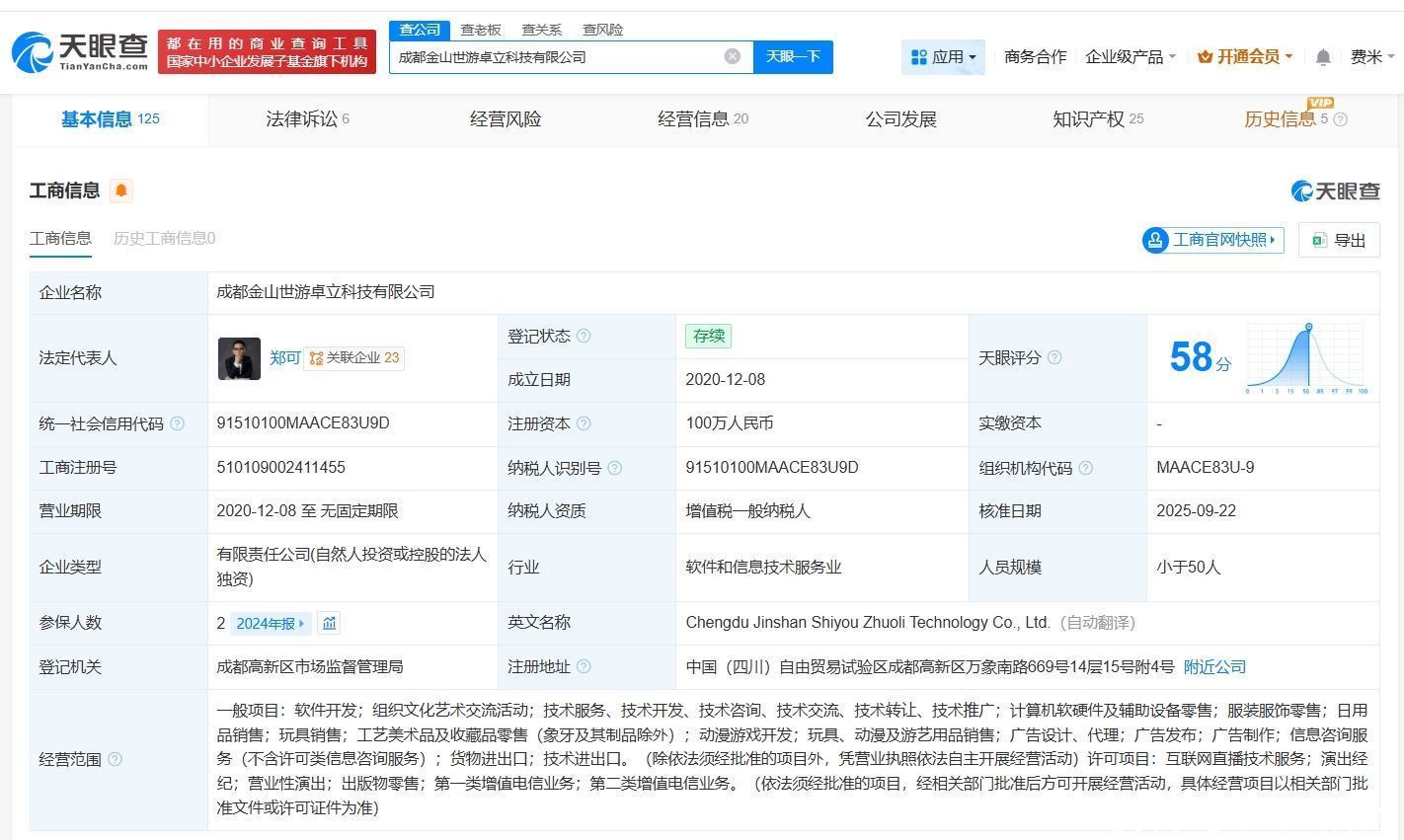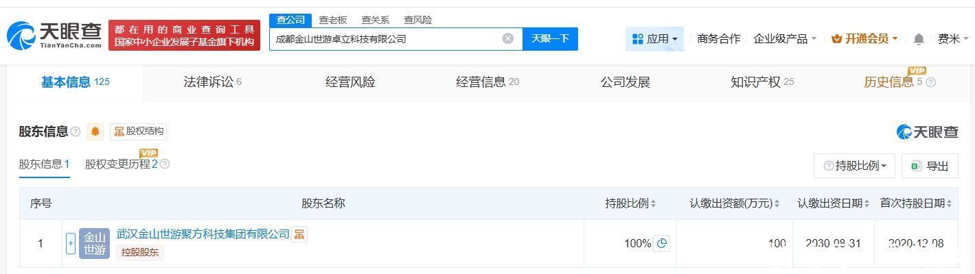 天眼查工商信息显示配资盈利网,鹅鸭杀手游开发商成都金山世游卓立科技有限公司成立于2020年12月,法定代表人为郑可,注册资本100万人民币,经营范围包括软件开发、组织文化艺术交流活动、计算机软硬件及辅助设备零售等。股东信息显示,该公司由武汉金山世游聚方科技集团有限公司全资持股。